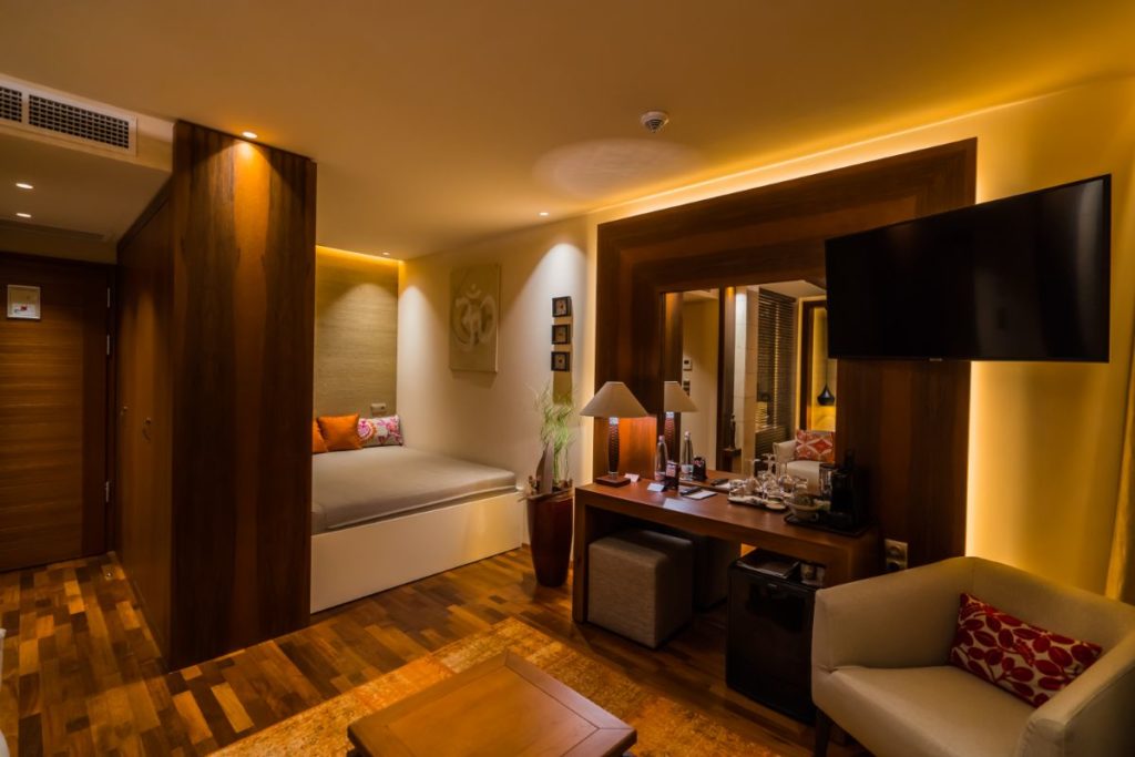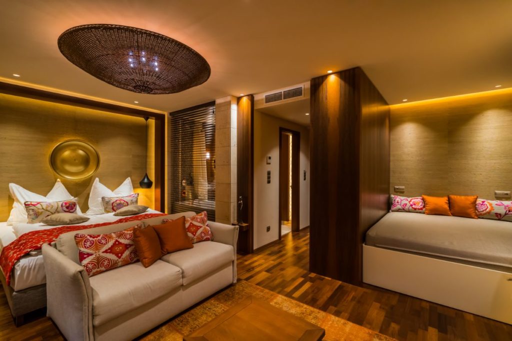 A szoba egyediségét a kézi szövésű faltapéta, az olasz mészkőburkolatok és az ágy fölé függesztett aranyszínű gong határozzák meg. A fürdőszoba és a hálószoba közötti üvegfal hangulata még intimebbé teszi a szoba légkörét. A Luxury Plus szobák enteriőrjére jellemző az ízlésesen elhelyezett egyedi faragványok és a trópusi faburkolat intenzívebb használata.