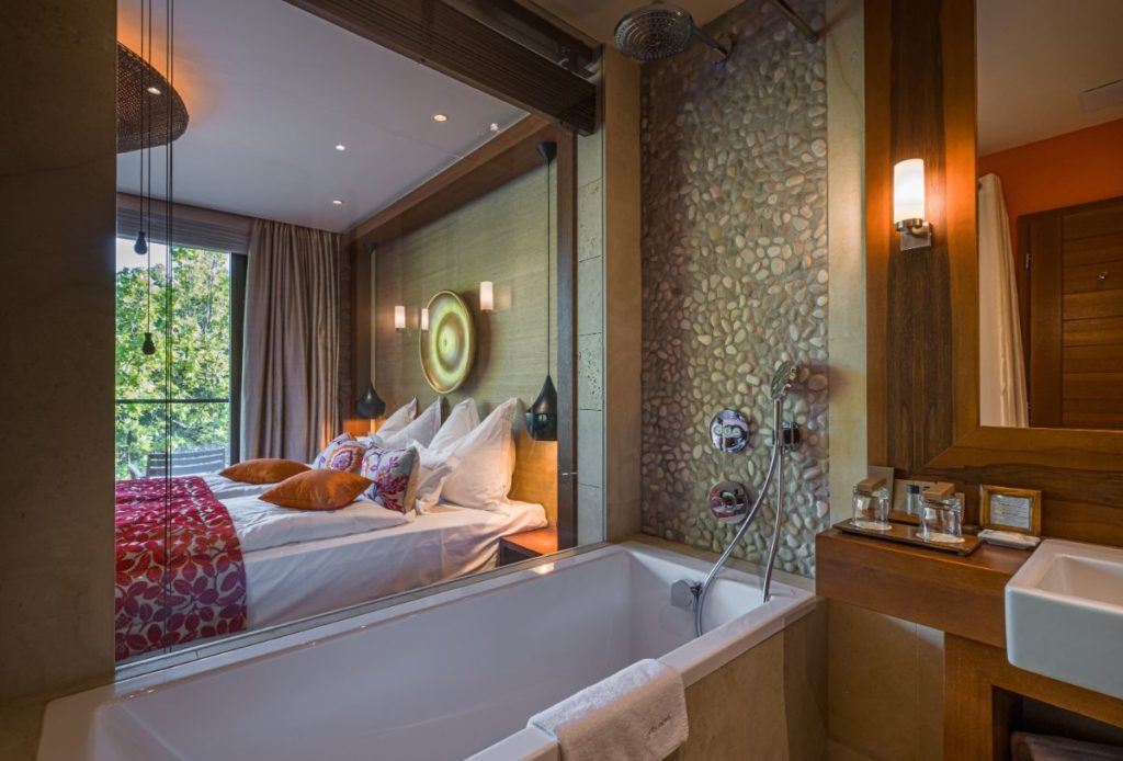 A szoba nem hiába kapott egy Plus jelzőt, a fürdőszobába lépve azonnal feltűnik a vendégeknek az extra különlegesség. A helyiség egyik fala üvegből készült, így akár a kádban fekve is csodálhatjuk a szoba által nyújtott keleti érzésvilágot.